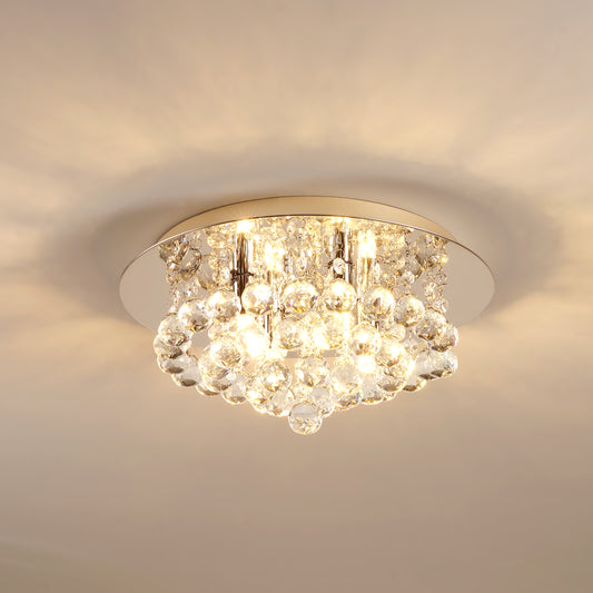 The HAUSPRO Rome Gold crystal light chandelier light is of the "Flush Mount" style, which means it is installed right up against the ceiling. The use of its Golden base and High Quality K9 Crystals gives it a very valuable and high-end look. If you want to add a sparkling and attractive touch to your lounge, bedroom, dressing room, or walk-in closet, this light is an excellent choice. Its cylindrical shape and sharp cut crystals make the light output many times brighter.