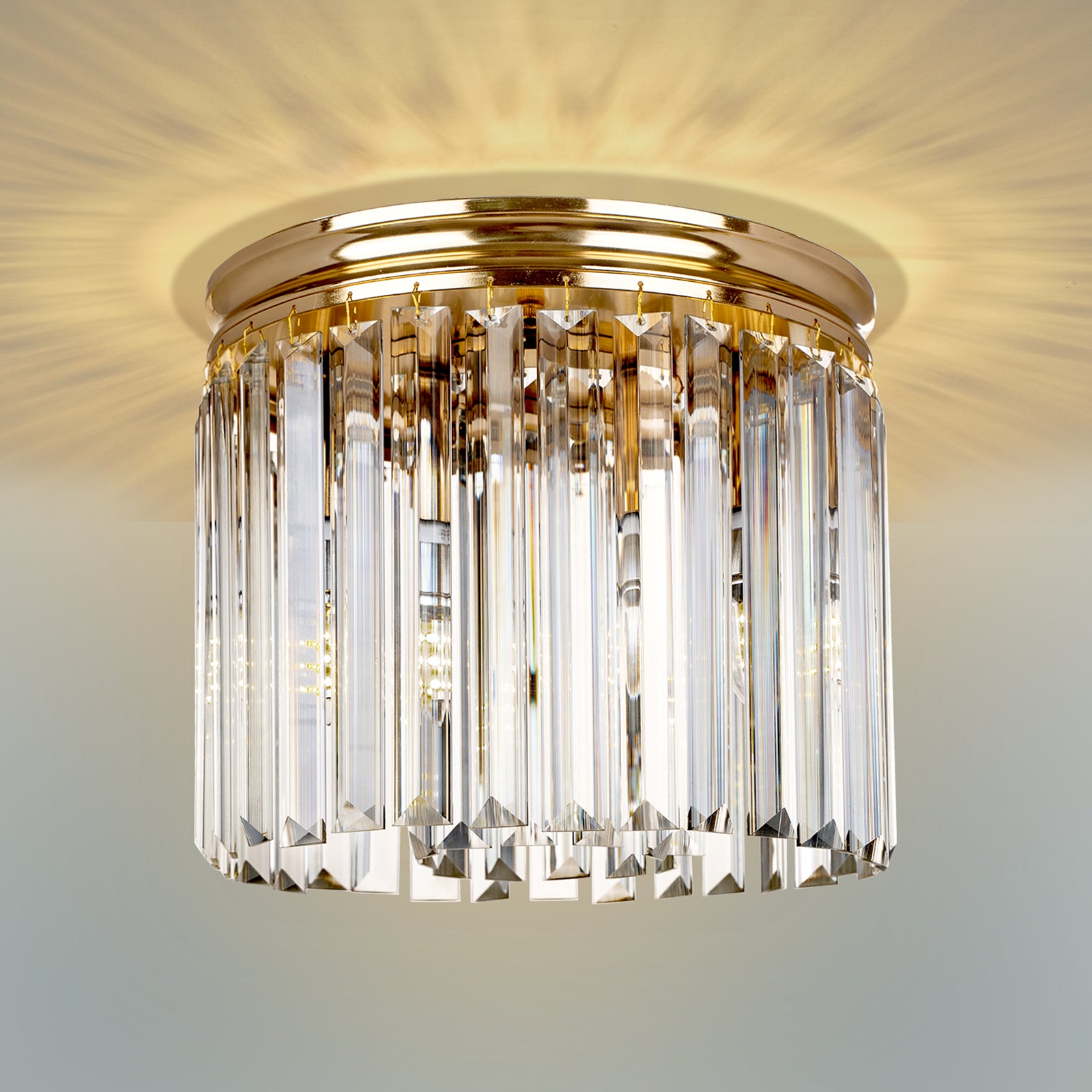 This crystal flush mount light is perfect for contemporary and glam style interiors. When the light is switched on, the crystal bars reflect the light through a prism effect, creating opulence and drama in the room. Due to its compact size, it is also ideal for small foyers, powder rooms, and ceilings with low height where traditional chandeliers might not fit.
